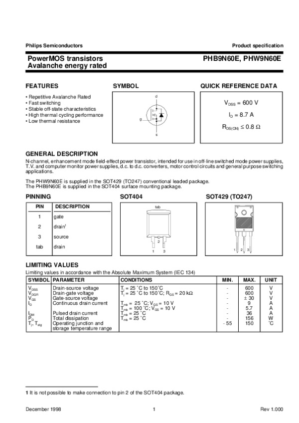 Datasheet PHB9N60EPHW9N60E3: