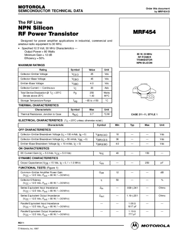 Datasheet MRF454REV1: