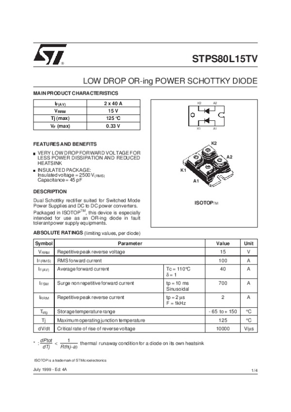 Datasheet STPS80L15TV: