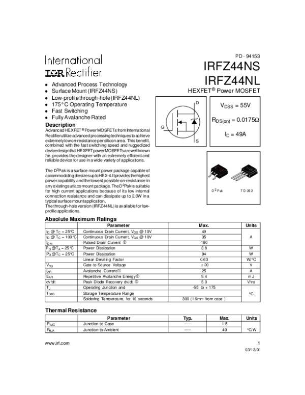 Просмотр технического описания на IRFZ44NSL