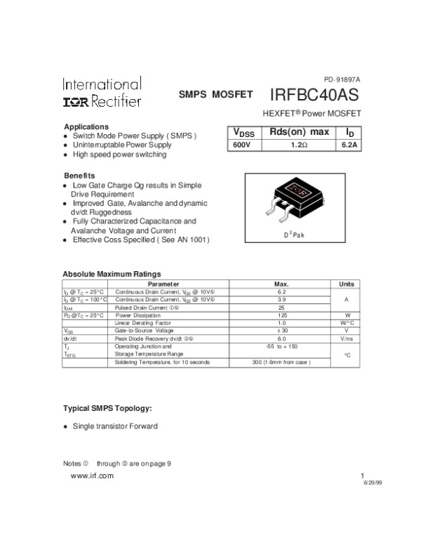 Просмотр технического описания на IRFBC40AS