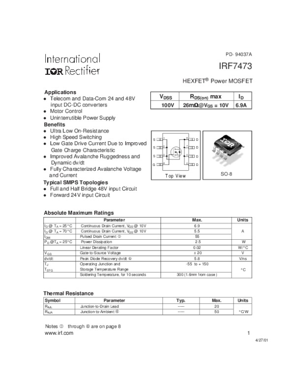 Просмотр технического описания на IRF7473