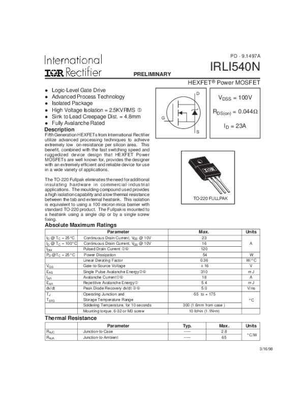 Просмотр технического описания на IRLI540N