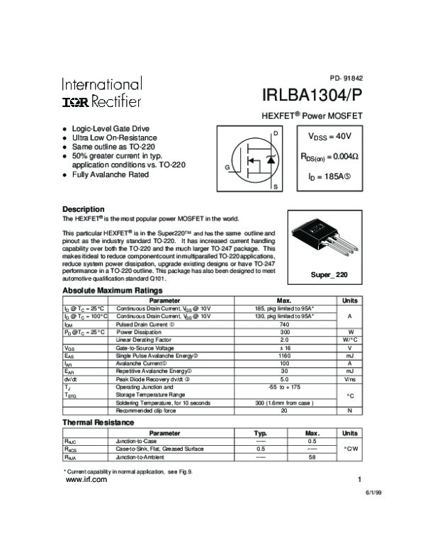 Просмотр технического описания на IRLBA1304