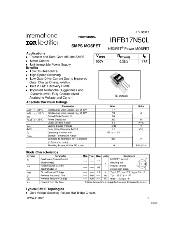 Просмотр технического описания на IRFB17N50L