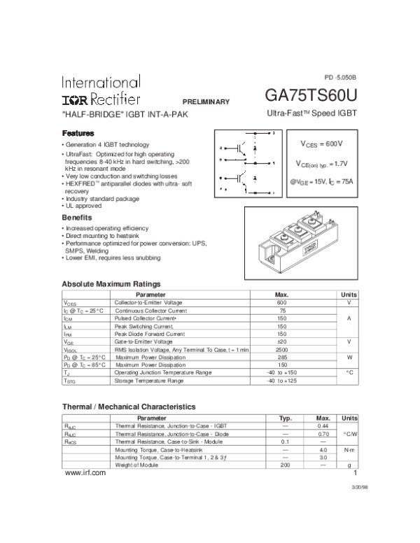 Datasheet GA75TS60U:
