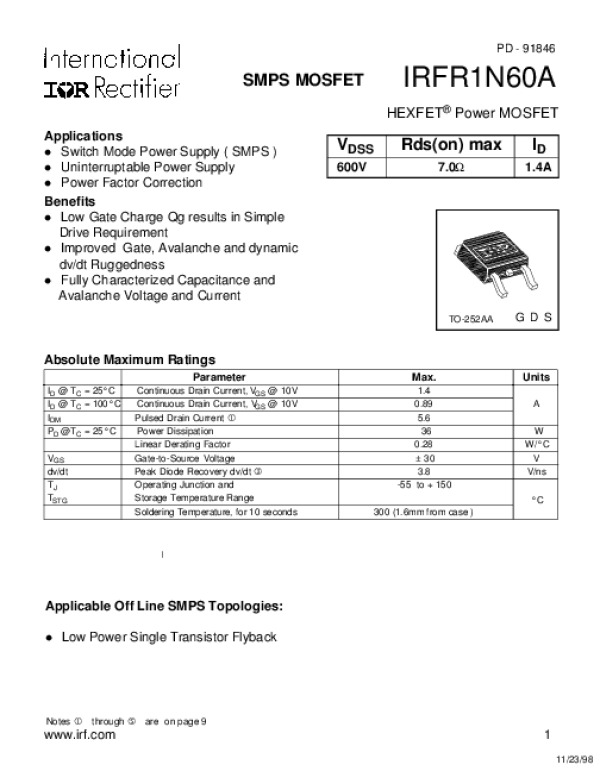 Datasheet IRFR1N60A: