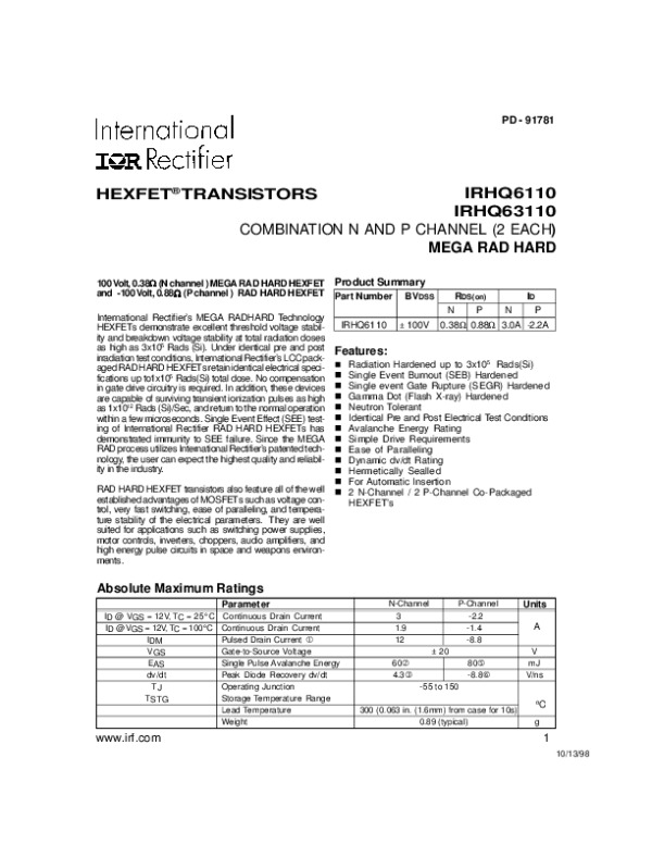 Просмотр технического описания на IRHQ6110