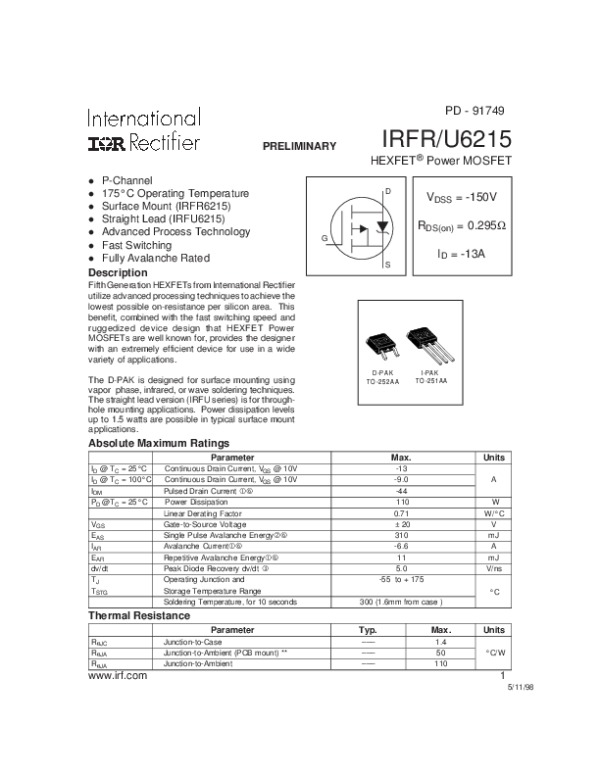 Просмотр технического описания на IRFR6215