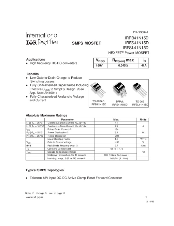 Datasheet IRFS41N15D: