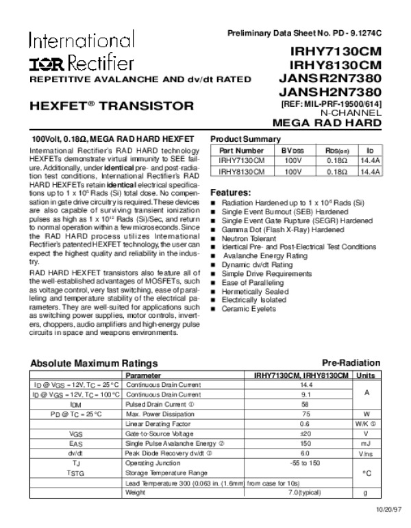 Просмотр технического описания на IRHY7130CM