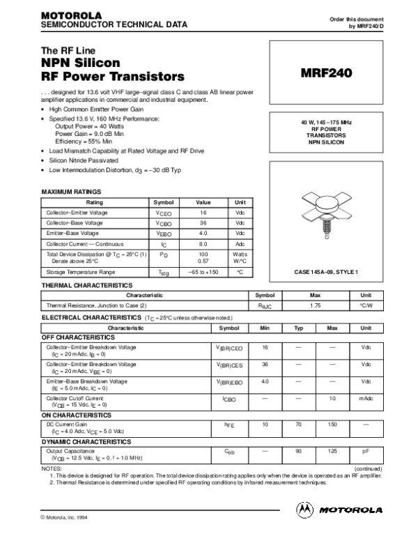 Datasheet MRF240REV0D: