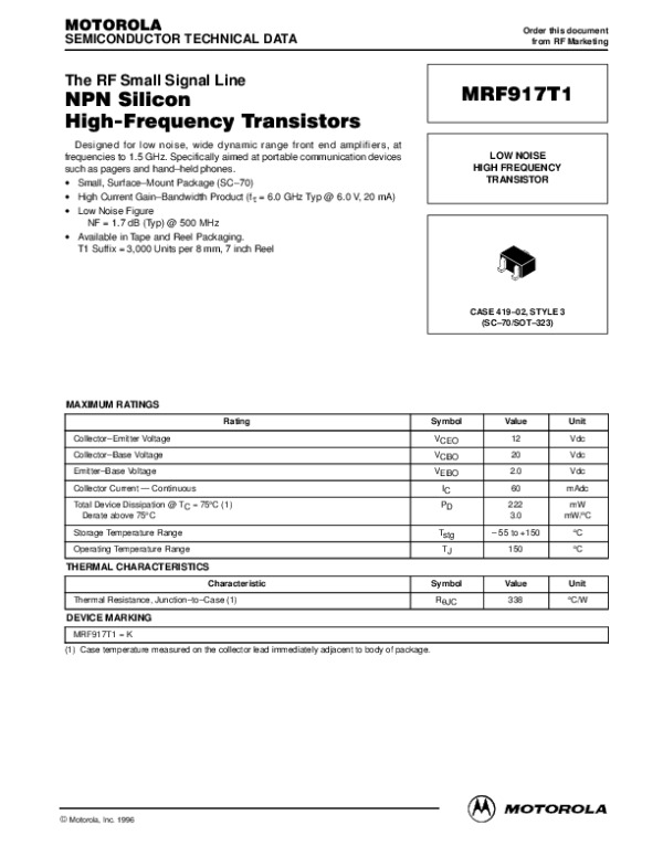 Datasheet MRF917T1REV0MDS: