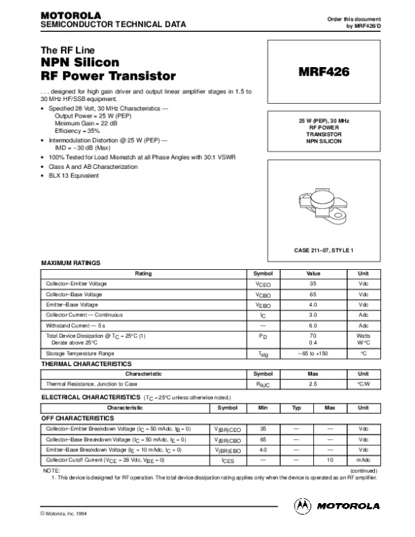 Datasheet MRF426REV0: