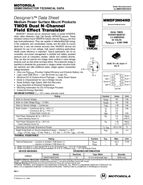 Datasheet MMDF3N04HDREV1: