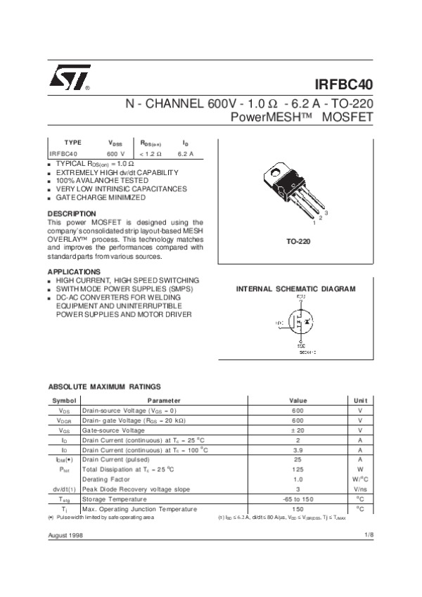 Просмотр технического описания на IRFBC40ST