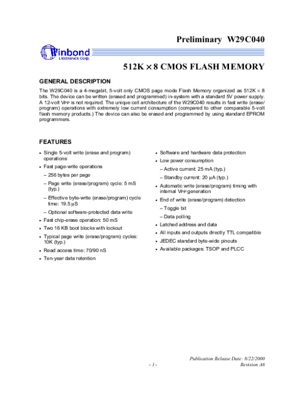 Datasheet W29C040: