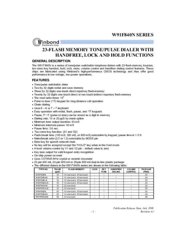 Datasheet W91F840N: