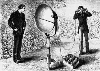 «Фотофон» Александра Белла, 1880. Наиболее удачным из подобных систем был «фотофон» представленный в 1878 Александром Беллом. В дальнейшем эта система, названная Беллом «радиофон», была улучшена и в 1904 демонстрировалась на выставке в Сент-Луи (штат Луизиана). Хотя изобретение привлекло повышенное внимание, в дальнейшем не нашло практического применения. Интересно отметить, что в названии устройства Белла использовалось слово «радио». …Радиофон, представленный на промышленной выставке, является единственным реальным методом беспроводной передачи речи. Его (Белла) метод мерцающих лучей прожектора может применяться для передачи человеческой речи и других звуков. Лучи света будут нести на многие мили все нюансы, все интонации голоса, оркестровую музыку, строчки песен. С помощью радиофона появляется возможность преобразования электрических огней в речь или музыку. Конечно, в этой газетной выдержке прослеживается определенный субъективизм по отношению к авторитету Белла, но, тем не менее, из нее видно, что нужно массам. Это ли не намек на скорое рождение радиовещания? Впрочем Белл не был столь претенциозен и предлагал свое устройство как… беспроводное дополнение к проводному телефону что-то наподобие современных домашних беспроводных телефонов. Другие ученые также работали над разновидностями телефонной связи с помощью света, используя в качестве источника электрическую дугу. Вплотную приблизившись к принципам дуги Поулсена, в 1897 профессор Саймон (Simon) обнаружил, что яркость свечения дуги изменяется при подаче в цепь ее питания напряжения с телефонного аппарата. Он высказал идею, что дуга, модулированная речью, может использоваться в качестве источника света в лучевом телефоне. Вполне вероятно, что именно эта идея навела Белла на мысль применить электрическую дугу в своих разработках. Примерно в то же время немецкий изобретатель Эрнст Румер (Ernst Ruhmer) оборудовал несколько военно-морских судов своей версией светового телефона. Ограниченные возможности (дальность, зависимость от погодных и световых условий) вскоре привели к прекращению развития световых устройств, и дали дополнительный импульс развитию радиотелефонии. Джон Троубридж (John Trowbridge) из Гарвардского университета в 1880 с помощью телефона Белла исследовал телеграфию Морзе, используя электрическую проводимость реки или влажной земли. Он установил, что если достаточно часто прерывать подачу напряжения, то благодаря изменениям напряжения могли воспроизводиться музыкальные звуки. Телеграф Морзе открывал новые возможности при замене проводов естественной проводимой средой. В 1882 Белл осуществил удачный эксперимент по посылке сообщения на расстояние около полутора миль на речное судно, с использованием телефонного аппарата, подсоединенного к пластинам, погруженным в речную воду.