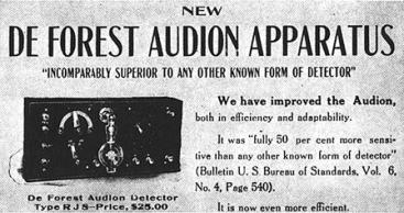 Аудион, 1906. Наибольшую известность де Форест получил за изобретение 3-х электродной электронной вакуумной лампы. В 1906 Форест добавил в диод Флеминга управляющий электрод сетку. Новая лампа получила название «аудион» (в последующем известна как триод) и нашла важное применение в качестве усилителя сигналов. В то время как Форест годами боролся в суде против Армстронга за право на принцип регенерации (обратную связь) аудиона, его изобретение осуществило подлинную революцию в ранних системах передачи голоса. Рзвитие голосового радио не ставило целей радиовещания музыки и информации. Если вы нуждались в спонсорах, если вы хотели заработать деньги, то это должна была быть радиотелефония для серьезной и выгодной двусторонней связи, подобно телефонии Белла. Форест использовал в своем варианте радиотелефона дугу Поулсена. Его первое важное изобретение заключалось во включении микрофона в цепь заземления. Это простое новшество с тех пор использовалось фактически во всех дуговых голосовых передатчиках. Форест был большим ценителем и любителем музыки, что, вероятно, стало предпосылкой к исследованиям в двух направлениях: совершенствование связи для флота и радиовещание. Первым заказчиком радиотелефона был флот. В связи с этим Форест писал: В 1909 я производил радиотелефоны для флота США. Каждый набор был проверен с помощью записей фонографа. К моему удивлению многие радиолюбители и профессиональные операторы наслаждались этими контрольными передачами. И естественно, что мне пришла идея относительно радиовещания: привлекательная музыка и интересные программы могли передаваться в эфир, создавая спрос на беспроводное оборудование. В 190708 Форест оборудовал головной корабль флота США «Огайо» и некоторые другие корабли дуговыми передатчиками и фонографами для трансляции во время плавания по всему миру. Получило широкий резонанс событие, когда в июне 1908, находясь на Западном побережье США, Форест, с борта корабля транслировал музыку фонографа и осуществлял радиосвязь с Мэри-Айленд (Mare Island), Сан-Франциско. Радиооператор Герберт Менератти (Herbert J. Meneratti) с корабля «Огайо» так описывал эти события в 1948: …Мы регулярно транслировали музыку на радиостанцию Мэри-Айленд. В наших отчетах записано, что с 1 июня по 5 июля (1908) мы не пропустили ни один день без трансляции… Менератти объявил, что 12 января 1908 «Огайо» будет транслировать музыку на другие суда флота. …Эту дату можно считать началом радиовещания, хотя мы и не называли это так. Другая ранняя попытка «радиовещания» была связана с любовью Фореста к опере. Он всегда восхищался этой формой музыкального искусства, но считал, что опера предназначена для людей с достатком, то есть для тех, кто мог себе позволить потратить время и деньги, чтобы посещать «живые» представления. Форест высказывал мнение, что в будущем любой человек сможет приобщиться к опере, используя радио: …Скоро будет возможным транслировать оперу от передатчиков, установленных на крыше «Metropolitan Opera House» на радиоприемники в практически любом доме Нью-Йорка и окрестностей... Церковная музыка, лекции и т.д., могут передаваться за границу посредством радио… Между 190712 Форест провел не менее 6 экспериментов по радиовещанию оперы с использованием дугового передатчика. В 2030-е годы, когда радиовещание стало свершившимся фактом, мно