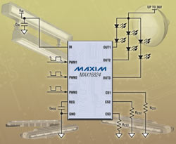 MAX16824, MAX16825 - высоковольтные 3-х канальные драйверы светодиодов высокой яркости