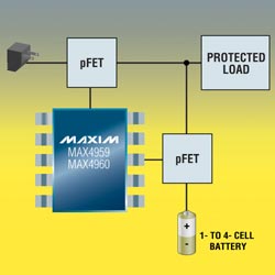 MAX4959, MAX4960 - высоковольтные контроллеры защиты от перенапряжений с переключением в режим питания от аккумулятора