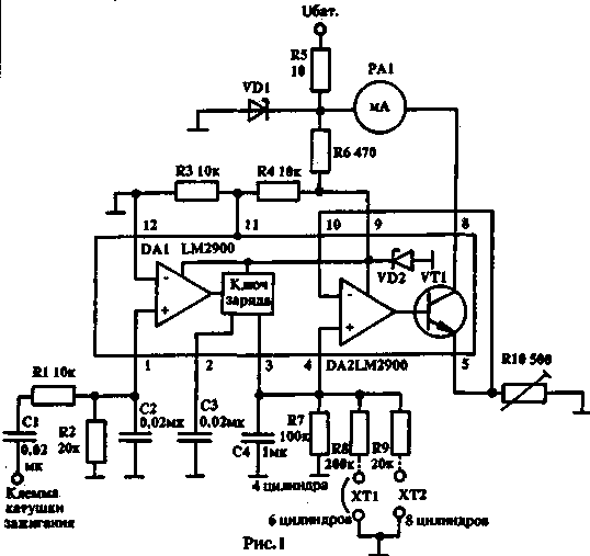 У кого из автолюбителей не сжималось сердце при знакомстве с "электронными иконостасами" на приборных щитках японских автомобилей. Чего там только нет! Нам бы хоть одну такую кнопку-лампочку... "Радиолюбитель" предлагает на выбор несколько зарубежных электронных новинок, которые, возможно, заинтересуют автолюбителей, умеющих владеть не только гаечным ключом и монтировкой, но и паяльником. Подборка материалов составлена из описаний практических устройств, разработки которых собраны американским инженером Рудольфом Графом и представлены в его сборнике "Электронные схемы: 1300 примеров". ТАХОМЕТР ДЛЯ ДВИГАТЕЛЯ ВНУТРЕННЕГО СГОРАНИЯ Этот тахометр удобен тем, что его можно установить на двигателе с любым числом цилиндров, лишь подключив к схеме (Рис. 1) подходящие времязадающие резисторы R7, R8 и R9. В качестве индикатора использован измерительный стрелочный прибор, расчитанный на ток полного отклонения стрелки 10 мА. Шкала этого прибора проградуирована в об./мин, а ее максимальный предел - 6000 об./мин.