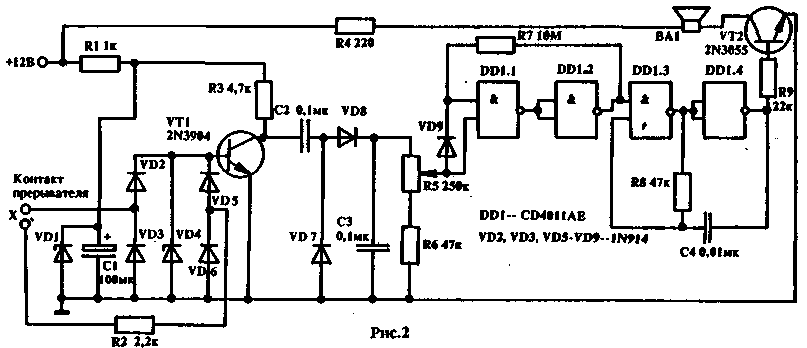 Подстроечный резистор R10 служит для окончательной калибровки прибора. Схема снабжена защитой от кратковременных превышений напряжения, состоящей из резистора R5 и стабилитрона VD1 с напряжением стабилизации 24 В. Соединение резисторов R7 - R9 с корпусом нужно производить в зависимости от числа цилиндров двигателя, т.е. R7, R8 и R9 - соответствуют четырем, шести и восьми цилиндрам. Отечественный аналог микросхем DA1, DA2 - К1401УД1. Транзистор VT1 - любой маломощный, кремниевый. СИГНАЛИЗАТОРЫ ПРЕВЫШЕНИЯ СКОРОСТИ Устройство срабатывает, если скорость автомобиля превысит заданную. В этом случае из динамика раздается назойливый звук, который исчезает вскоре после снижения скорости на 5 - б км/час. Схема (Рис. 2) состоит из выпрямительного моста на диодах VD2 - VD6, который выпрямляет импульсы поступающие от контактов прерывателя автомобиля, при этом полученное постоянное напряжение ограничивается стабилитроном VD4 на уровне 4,7 В. Это напряжение, пропорциональное числу оборотов двигателя, после транзистора VT1 и диодного детектора VD7 - VD8 попадает на потенциометр R5, являющийся регулятором порога срабатывания устройства. Сигнал с него управляет формирователем и мультивибратором на логических элементах микросхемы DD1.