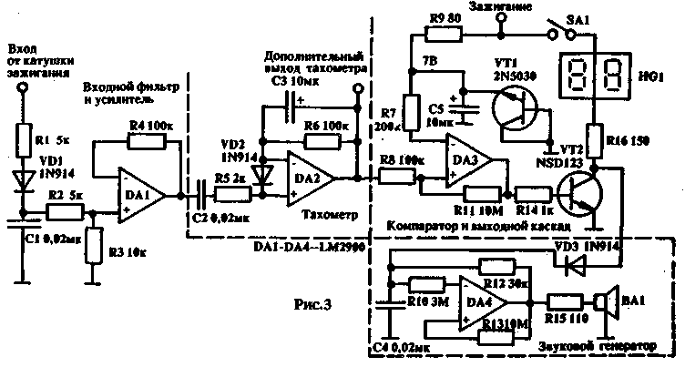Транзистор VT2 усиливает сигнал мультивибратора до необходимых пределов, в его коллекторную цепь включен динамик ВА1. Аналогами CD4011АЕ являются отечественные цифровые микросхемы К176ЛА7 и К561ЛА7. Стабилитрон VD1 - на напряжение стабилизации 9 В типа Д814Б. Всем другим диодам соответствует оте-чественный аналог - КД521А. Схема другого сигнализатора превышения скорости (Рис. 3) состоит из четырех усилителей на микросхемах LM2900, отечественным аналогом которых является четырехканальный операционный усилитель К1401УД1. Усилитель DA1 обрабатывает сигнал, поступающий от катушки зажигания. Усилитель DA2 преобразует частоту в напряжение так, что напряжение на его выходе пропорционально