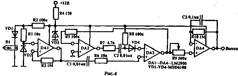 числу оборотов двигателя. DA3 сравнивает напряжение тахометра с опорным напряжением и включает выходной транзистор при превышении установленной скорости. DA4 используется в схеме генератора, вырабатывающего звуковой сигнал. В устройстве можно применить отечественные транзисторы КТ315. Диоды "меняются на КД521А. ТАХОМЕТР В этом тахометре (Рис. 4) в качестве датчика импульсов используется магнитная головка. Сигналы усиливаются DA1 и подаются на вход ждущего мультивибратора на элементах DA2 и DA3, после чего прямоугольные импульсы через регулирующий потенциометр R9 попадают на формирователь DA4 и затем - на прибор с измерительной шкалой, проградуированной в об./мин. Все микросхемы - К1401УД1, диоды - КД521А, стабилитрон VD3 - КС168А.