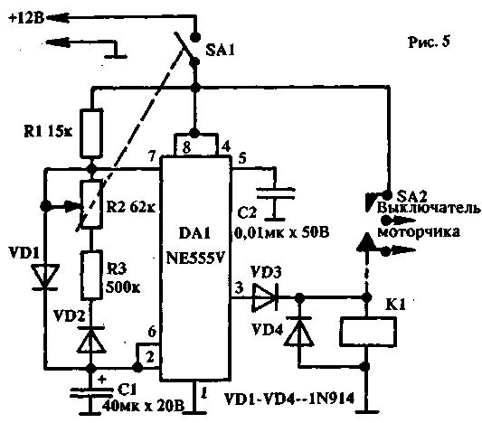 УСТРОЙСТВО УПРАВЛЕНИЯ ЧАСТОТОЙ ДВИЖЕНИЯ СТЕКЛООЧИСТИТЕЛЯ Регулятор для стеклоочистителя, в схеме которого (Рис. 5) использован интегральный таймер NE555V, позволяет задавать длительность временных интервалов в течение которых происходит "качание" стеклоочистителя. Микросхема DA1 работает в режиме несинхронизированиого мультивибратора. Длительность интервала, в течении которого таймер находится в включенном состоянии, определится номиналами С1, R2 и R3. Потенциометром R2 можно изменять частоту работы стеклоочистителя от 2 до 15 сек. В устройстве можно применить отечественную микросхему КР1006ВИ1. Реле с сопротивлением обмотки электромагнита - 1200 Ом. Все диоды - КД521А.