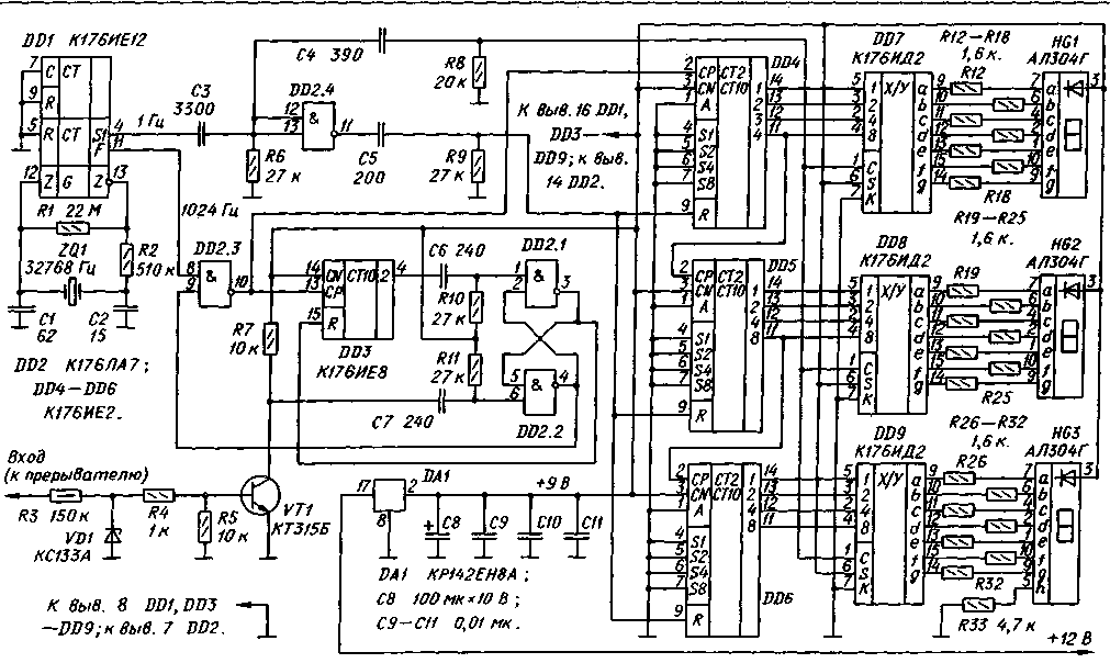 Предлагаемый прибор весьма прост по схеме, но обладает хорошими техническими характеристиками, собран на доступных компонентах. Тахометр может оказаться очень полезным при регулировочных операциях с электронными блоками зажигания двигателя автомобиля, при точной установке порогов срабатывания экономайзера и др. А вот целесообразность использования цифрового тахометра в качестве бортового (установленного на приборном щитке) мы бы поставили под большое сомнение, и об этом в журнале "Радио" была в свое время помещена статья А. Межлумяна "Цифровая или аналоговая?" -1986, № 7, с. 25, 26. Тахометр предназначен для измерения частоты вращения коленчатого вала четырехцилиндрового автомобильного бензинового двигателя. Прибор может быть использован как для регулировочных работ на холостом ходе, так и для оперативного контроля частоты вращения вала двигателя во время движения. Цикл измерения равен 1 с, причем время индикации также равно 1 с, т. е. в течение времени индикации происходит очередное измерение, смена показаний индикатора происходит один раз в секунду. Максимальная погрешность измерения 30 мин~1, число разрядов индикатора - 3; переключения пределов измерения не предусмотрено. Тахометр имеет кварцевую стабилизацию тактового генератора, поэтому погрешность измерений не зависит от температуры окружающей среды и изменений напряжения питания. Принципиальная схема тахометра показана на рис. 1. Функционально прибор состоит из кварцованного генератора, собранного на микросхеме DD1, входного узла на транзисторе VT1, утроителя частоты входных импульсов на элементах DD2.1-DD2.3 и счетчике DD3, счетчиков DD4-DD6, преобразователей кода DD7-DD9, цифровых индикаторов HG1-HG3 и стабилизатора напряжения питания ОА1. Сигнал на входной узел тахометра поступает с контактов прерывателя.