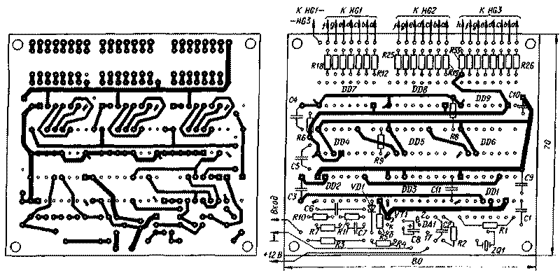 После подачи напряжения питания триггер DD2.1, DD2.2 может оказаться в любом состоянии (из двух возможных). Предположим, что на выходе элемента DD2.2 присутствует напряжение низкого уровня, которое запрещает прохождение через элемент DD2.3 импульсов частотой 1024 Гц с выхода F счетчика DD1 на счетный вход СР счетчиков D03 и DD4. При размыкании контактов прерывателя транзистор VT1 откроется, переключит триггер DD2.1, DD2.2 и откроет элемент DD2.3. Счетчики DD3 и DD4 начнут счет импульсов частотой 1024 Гц. По спаду третьего входного импульса счетчика DD3 на его выходе 2 сформируется импульс, который переключит триггер DD2.1, DD2.2 в исходное состояние, элемент D02.3 окажется снова закрытым, а счетчик DD3 - обнуленным. При следующем импульсе с прерывателя процесс повторится. Таким образом, при каждом размыкании контактов прерывателя число, записанное в цепь счетчиков DD4-DD6, будет увеличиваться на 3. Процесс записи будет продолжаться в течение секунды, т. е. до того момента, когда на выходе S1 счетчика DD1 появится очередной положительный перепад напряжения. В этот момент информация, накопившаяся в счетчиках DD4-DD6, будет переписана в буферные регистры преобразователей кода DD7-DD9, а вскоре счетчики DD4-DD6 обнулит по входу R сигнал с цепи C5R9. Сразу после спада импульса высокого уровня на входе счетчиков DD4-DD6 начнется новый цикл записи и т. д. Для обеспечения необходимой временной задержки между моментами перезаписи информации из счетчиков DD4-DD6 в буферные регистры преобразователя кода DD7-DD9 и обнуления счетчиков служат дифференцирующие цепи C3R6, C4R8, C5R9 и элемент DD2.4. Утроение частоты импульсов, поступающих с прерывателя, необходимо для получения соответствия между показаниями индикатора и частотой вращения коленчатого вала двигателя в мин-1. Так как время счета входных импульсов равно 1 с, то в счетчики запишется, а затем будет выведено на индикаторы число 2N3/60, где N - частота вращения коленчатого вала в мин-1, 2N - частота искрообразования. При частоте вращения вала 3000 мин-1 показания индикатора будут 3.00. Все детали тахометра, кроме стабилизатора напряжения DA1 и индикаторов HG1-HG3, размещены на печатной плате из двустороннего фольгированного стек-лотекстолита. Чертеж печатной платы и расположение деталей на ней представлены на рис. 2. Тахометр некритичен к типу применяемых деталей. Номиналы резисторов и конденсаторов могут отличаться от указанных на схеме на ±20 %. Резистор R1 - КИМ, но поскольку вы-сокоомные резисторы довольно дефицитны, на плате предусмотрены монтажные площадки для установки вместо одиночного резистора номиналом 22 МОм последовательно нескольких меньшего сопротивления. Кварцевый резонатор ZQ1 - любой, от цифровых часов. Стабилитрон VD1 - лю- ¦ бой малогабаритный на напряжение стабилизации 3...5 В. Микросхемы серии К176 можно заменить на соответствующие серии К561. Микросхемный стабилизатор КР142ЕН8А установлен на тепло-отвод площадью около 10 см2. В тахометре использованы семиэлементные индикаторы АЛ304Г (высота цифр - 3 мм) с большой яркостью свечения и сравнительно небольшим потребляемым током (около 5 мА на элемент). Яркости свечения вполне достаточно для уверенного считывания информации в салоне автомобиля даже в солнечную погоду. Табло тахометра следует накрыть плотным светофильтром соответствующего цвета. При необходимости можно использовать индикаторы и с более крупными ци
