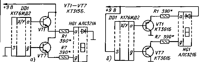 Обращаем внимание на то, что при использовании индикаторов с общим катодом АЛС321А и АЛС324А на вход S преобразователей кода DD7-DD9 следует подавать напряжение низкого уровня (выводы 6 соединить с общим проводом). Разумеется, использование крупно-знаковых индикаторов потребует коррекции печатной платы и установки стабилизатора DA1 на теплоотвод большей площади (не менее 30 см2). Правильно собранный из исправных деталей тахометр начинает работать сразу, и табло должно высветить нулевое показание примерно через 2 с после включения питания. Если этого не произошло, следует проверить наличие секундных импульсов на выходе S1 счетчика DD1. Их отсутствие или заметное отличие периода от 1 с означает скорее всего неисправность кварцевого резонатора. Для проверки работоспособности остальных узлов тахометра можно сигнал с вывода 3 счетчика DD1 (импульсы с частотой 128 Гц) подать через резистор сопротивлением 10 кОм на базу транзистора VT1. При этом на индикаторе должно появиться число 3.84. В автомобиле, оборудованном стандартной батарейной системой зажигания, вход тахометра подключают к выводу прерывателя. При бесконтактной электронной системе зажигания тахометр можно подключить к ее выходу, увеличив сопротивление резистора R3 до 200-250 кОм, причем этот резистор желательно установить не на плате, а в разрыв провода, идущего от платы тахометра к выходу системы зажигания. Это вызвано тем, что напряжение на выходе электронной системы зажигания может достигать 400 В и даже более, что может привести к пробоям на плате тахометра. Если электронная система зажигания работает от контактного прерывателя, то тахометр подключают к выводу прерывателя, уменьшив сопротивление резистора R3 до12к0м. в А. БИРЮКОВ, г. Москва