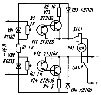 При положительном полупериоде входного переменного напряжения ток протекает через элементы VD1, R1 и стабилизируется диодом VD2. Часть стабилизированного напряжения через переменный резистор R3 подается на базу транзистора VT2. Транзисторы VT2 и VT4 нижнего плеча устройства работают как генератор тока, величина которого зависит от сопротивления резистора R4 и напряжения на базе VT2. Зарядный ток в цепи аккумулятора протекает по элементам VD3, SA1.1, РА1, SA1.2, аккумулятор, коллекторный перепад транзистора VT4, R4. При отрицательном полупериоде переменного напряжения на диоде VD1 рабо-та устройства аналогична, но работает верхнее плечо - VD1 стабилизирует отрицательное напряжение, которое регулирует протекающий по аккумулятору ток в обратном напряжении (ток разрядки). Показанный на схеме миллиамперметр РА1 используется при первоначальной настройке, в дальнейшем его можно отключить, переведя переключатель в другое положение. Такое зарядное устройство обладает следующими преимуществами: 1. Зарядный и разрядный токи можно регулировать независимо друг от друга. Следова-тельно, в данном устройстве возможно применять аккумуляторы с различной величиной энергоемкости. 2. При каких-либо пропаданиях переменного напряжения каждое из плеч закрывается и через аккумулятор ток не протекает, что защищает аккумулятор от самопроизвольной разрядки. В данном устройстве из отечественных элементов можно применить в качестве VD1 и VD2 - KC133A, VT1 и VT2 - КТ315Б или КТ503Б. Остальные элементы выбираются в зависимости от зарядного тока. Если он не превышает 100 мА, то в качестве транзисторов VT3 и VT4 следует применить КГ815 или КТ807 с любыми буквенными индексами (расположить на теплоотводе с площадью теплорассеиваюшей поверхности 5...15 кв.см), а в качестве диодов VD3 и VD4 - Д226, КД105 тоже с любыми буквенными индексами.