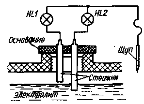 Удалив пробку, в банку через наливное отверстие вводят стержни индикатора до основания и гибким щупом касаются одного из полюсных выводов батареи. Если при этом ни одна из ламп не горит, значит, уровень электролита в проверяемой банке ниже допустимого. Свечение только одной лампы HL2 укажет на то, что уровень электролита в банке ниже нормального, обеих ламп - уровень нормальный.