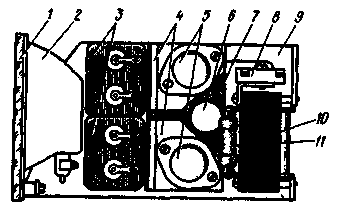 Рис. 2. Вид на монтаж осветителя: 1 - рассеиватель. 2 - рефлектор с импульсной лампой, 3 - накопительные конденсаторы, 4 - теплоотводы, дюралюминий. 5 - транзисторы, 6 - электролитические конденсатор К50-6, 7 - монтажная плата, стеклотекотолит, 8 - диодная сборка КЦ402И, 9- пластина-основание, дюралюминий. 10 - трансформатор. 11 - резистор МЛТ-23,6 к Устройство переходника показано на рис. 3. В корпусе 3, выточенном в виде трубки из твердого теплостойкого изоляционного материала (текстолита, гетинакса), смонтированы резисторы R4-R6. Провод, соединяющий переходник с осветителем, должен быть с изоляцией, рассчитанной на напряжение не менее 15 кВ.
