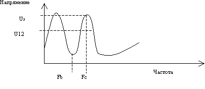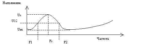 Где на схеме испытуемый динамик, я думаю, ясно. Остальные элементы схемы требуют развернутого пояснения. Генератор – либо генератор звуковой частоты способный выдавать напряжение 10-20 В, либо сочетание генератор-усилитель, удовлетворяющее тому же требованию. 1000 Ом – резистор 1000 Ом, стабилизирующий ток через динамик. Номинал резистора можно брать меньше, но это будет снижать точность вычисления Qts. (Правда при использовании резистора всего 200 Ом погрешность измерения вряд ли превысит 10%, но, как говориться, береженного … ). а, в, с – точки для подсоединения вольтметра. Сам вольтметр на рисунке не указан, но он должен быть: - во-первых, переменного тока; - во-вторых, уметь измерять напряжения порядка 100 мВ. При отсутствии у вольтметра такого предела измерений, его можно подключить через усилитель. А так как современные усилители обычно “стерео” и более, особых проблем с этим нет. Схема собрана. 2) Размещаем динамик вдали от стен, потолка и пола (часто рекомендуют подвешивать). 3) Подключаем вольтметр к точкам а и с, и устанавливаем напряжение равным 10-20 В на частоте 500-1000 Гц. 4) Подключаем вольтметр к точкам в и с, и изменяя частоту генератора находим частоту, на которой показания вольтметра максимальны, см. рисунок ниже по тексту. Это и есть Fs. Записываем Fs и Us-показания вольтметра. 5) Изменяя частоту вверх относительно Fs, находим частоты, на которых показания вольтметра постоянны и значительно меньше Us (при дальнейшем повышении частоты напряжение опять начнет увеличиваться, пропорционально увеличению импеданса динамика). Запишем это значение, Um. График импеданса динамика в свободном пространстве и в закрытом ящике выглядит приблизительно так.