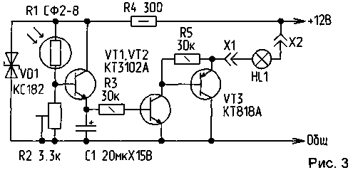 ![]() Puc.2 Недостатком выпускаемых противоослепляющих фонарей является их раннее либо позднее включение. Особенно опасно позднее включение, когда от резкого яркого света засвечивается сетчатка глаз, и включение фонаря оказывается малоэффективным. Предлагаемая схема автоматического включения и выключения фонаря имеет следующие достоинства перед опубликованной в [2]: - включение всего устройства происходит одновременно с
