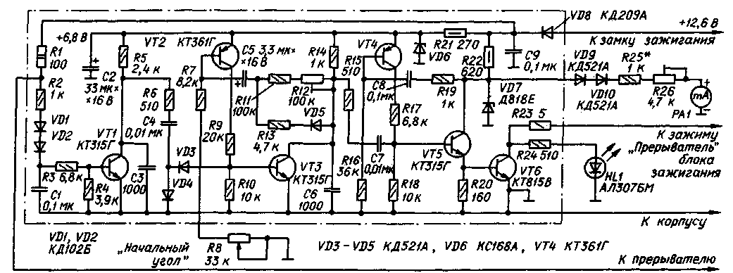 Допустим, что в исходном состоянии контакты прерывателя замкнуты, тогда транзистор VT1 узла запуска закрыт. Формирующий конденсатор С5 в первом мультивибраторе заряжен током через эмиттерный переход транзистора VT2, резисторы R11, R12 и транзистор VT3 (время зарядки конденсатора С5 можно регулировать резистором R12). Формирующий конденсатор С8 второго мультивибратора также будет заряжен. Так как транзисторы VT4 и VT5 открыты, то VT6 будет тоже открыт и замкнет вывод "Прерыватель" блока зажигания через резистор R23 на корпус. При размыкании контактов прерывателя транзистор VT1 открывается, а VT2 и VT3 закрываются. Формирующий конденсатор С5 начинает перезаряжаться через цепь R7R8R14VD5R13. Параметры этой цепи подобраны так, что перезарядка конденсатора происходит намного быстрее, чем его зарядка. Скорость перезарядки регулируют резистором R8. Когда напряжение на конденсаторе С5 достигнет уровня, при котором открывается транзистор VT2, мультивибратор возвращается в исходное состояние. Чем чаще происходит размыкание контактов прерывателя, тем до меньшего напряжения заряжается конденсатор С5 и тем меньше будет длительность импульса, сформированного первым мультивибратором. Этим достигнута обратно пропорциональная зависимость между временем задержки искрообразования и частотой вращения коленчатого вала двигателя. Спад импульса, сформированного первым мультивибратором, через конденсатор С7 запускает второй мультивибратор. Он формирует импульс длительностью около 2,3 мс. Этот импульс закрывает транзисторный ключ VT6 и отключает зажим "Прерыватель" от корпуса и тем самым имитирует размыкание контактов прерывателя, но с задержкой на время т, определяемое длительностью импульса, сформированного первым мультивибратором. Светодиод HL1 информирует о прохождении импульса от датчика-прерывателя через электронный корректор до блока зажигания. Резистор R23 защищает транзистор VT6 при случайном подключении его коллектора к плюсовому проводу бортовой сети автомобиля. Защиту устройства от дребезга контактов прерывателя обеспечивает конденсатор С1, который создает временную задержку (около 1 мс) закрывания транзистора VT1 после замыкания контактов прерывателя. Диоды VD1 и VD2 препятствуют разрядке конденсатора С) через прерыватель и компенсируют падение напряжения, возникающее на проводнике, соединяющим двигатель с кузовом автомобиля при включении стартера, что повышает надежность работы электронного корректора во время пуска двигателя. От помех, возникающих а бортовой сети, устройство защищает цепь VD8C9, стабилитроны VD6, VD7, резисторы R2, R6, R15 и конденсаторы С2, СЗ, Сб. Частоту вращения коленчатого вала измеряет цепь VD9VD10R25R26PA1. Шкала этого тахометра линейна, так как импульсы напряжения на коллекторе транзистора VT5 имеют постоянную длительность и амплитуду, обеспечиваемые стабилитроном V07. Диоды VD9, VD10 исключают влияние остаточного напряжения на транзисторах VT5, VT6 на показания тахометра. Частоту вращения отсчитывают по шкале миллиамперметра РА1 с током полного отклонения стрелки 1...3 мА. В корректоре использованы конденсаторы К73-17 - С1, С8, С9; К53-14-С2, С5; К10-7 - СЗ, С6; КЛС - С4. С7. Резистор R8 - СПЗ-12а, R12 - СПЗ-6, R23 - составлен из двух резисторов МЛТ-0,125 сопротивлением 10 Ом. Диоды КД102Б, КД209А можно заменить на любые из серии КД209 или КД105; КД521А - на КД522. КД503, КД102, КД103, Д223 - с любым