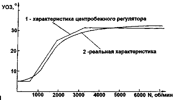 Проблема получения от двигателя внутреннего сгорания максимальной мощности интересует многих автолюбителей. Для повышения мощности двигателя можно произвести расточку и полировку топливопроводов, подгонку их стыков с камерой сгорания, форсирование и т. д. Но, кроме этого, существует и другой способ повышения мощности двигателя - минимизация потерь за счет поддержания оптимального угла опережения зажигания во всем диапазоне скорости вращения коленчатого вала (KB). Большинство "западных" фирм этот вопрос решило давно - бортовой компьютер контролирует все процессы в работе двигателя и управляет ими. В отечественном автомобилестроении этому вопросу не уделяли должного внимания и, как следствие, характеристика угла опережения зажигания, формируемая центробежным регулятором, установленным почти на всех отечественных автомобилях, совпадает с оптимальной характеристикой в лучшем случае в 2-3 точках (рис. 1) На некоторых участках она может отличаться от оптимальной более чем на 30%, и при длительной эксплуатации автомобиля эта величина растет.