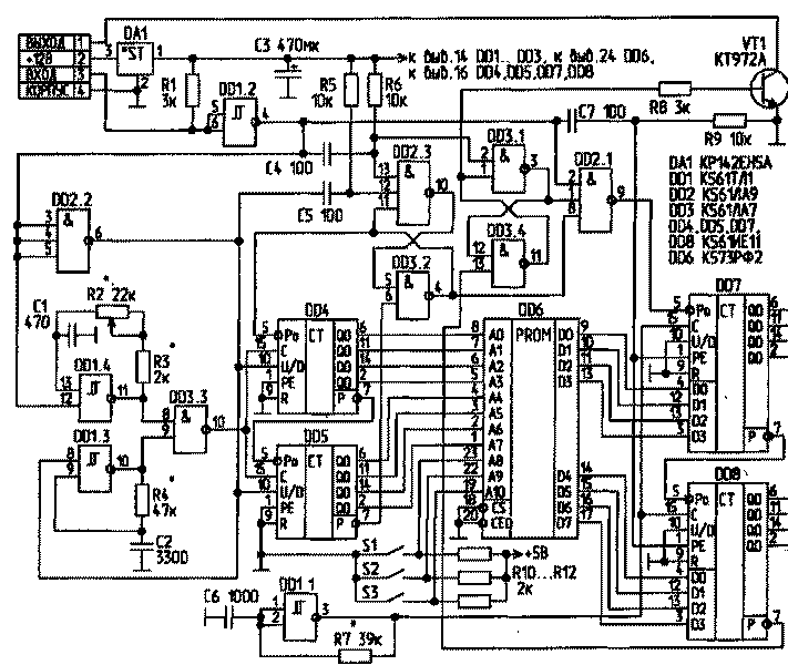 Характерные точки диаграмм: 0 - начало положительного входного импульса, разрешение работы счетчиков DD4, DD5 на приращение до окончания входного импульса или до их переполнения; 1 - (только для режима запуска двигателя) - содержимое счетчиков DD4, DD5 достигло максимума (255); блокировка DD4, DD5 до окончания входного импульса; 2 - запись содержимого DD4, DD6 через преобразователь кода DD6 в DD7, DD8; конец работы Г1; сброс блокировки DD4, DD5 и начало их работы от Г2 на вычитание; 3 - содержимое DD4, DD5 достигло нуля, и их работа блокируется; разрешение работы DD7, DD8; 4 - содержимое DD7, DD8 достигло нуля, и их работа блокируется; на коллекторе VT1 формируется сигнал, по переднему фронту которого происходит зажигание; 5 - верхняя мертвая точка соответствующего поршня; 6 - сброс блокировки DD4, DD5; начало следующего цикла. Для наладки устройства необходимо знать два параметра: -длину импульса, выдаваемого магнитным датчиком, выраженную в угловых величинах (градусах) относительно периода вращения KB - оптимальную характеристику угла опережения зажигания (зависимость от оборотов KB). Поскольку указанная характеристика специфична для разных автомобилей, можно поступить двумя способами. Первый способ. Используя свободные адресные разряды применяемого ПЗУ (А8, А9, А10), коммутируемые переключателями S1 ...S3 (рис.2), записываем в него 8 вариантов характеристик, получаемых смещением по горизонтальной оси через каждые 50... 100 об/ мин исходной характеристики 2 (рис.1), которая характерна для многих автомобилей. После этого, оперируя переключателями S1...S3 и регулятором R2, в ходе многочисленных проб, по субъективным признакам, определяем наиболее подходящую. Следует заметить, что при переходе на бензин с меньшим октановым числом необходимо переходить на характеристику, которая находится левее от исходной, и наоборот. Найдя наиболее подходящую характеристику, целесообразно переписать ПЗУ, снова смещая полученную характеристику, но с меньшим шагом, например через 20...30 об/мин, при этом выбор необходимой марки бензина производится переключателями S1...S3. К недостаткам данной схемы относится низкая стабильность генераторов. Для ее увеличения и генераторах нужно применять резисторы с минимальным ТКС и конденсаторы с нулевым ТКЕ (группы МПО). По этой же причине устройство лучше разместить в салоне автомобиля, где перепады температур меньше, чем под капотом. Для уменьшения помех на выводы питания каждой микросхемы целесообразно установить керамические конденсаторы емкостью 0,1 мкФ, а при длинных коммутационных связях на входе микросхемы DD1.2 - простейший фильтр НЧ с постоянной времени порядка 0,01 мс (например R=30 кОм, С=300 пФ). Кроме того, в некоторых экземплярах счетчиков при совпадении фронтов счетных и управляющих сигналов, а также при переходе счета из одного каскада в другой возникают сбои в работе. Для устранения указанного явления необходимо установить конденсаторы емкостью 100...200 пФ между выводами 6 DD2, 7 DD8 и общим проводом питания. Формирователь устанавливается в разрыв между магнитным датчиком оборотов распредвала и системой электронного зажигания. При установке формирователя шторку штатного центробежного регулятора необходимо застопорить в положении, соответствующем максимальной скорости вращения КВ. Дополнительно, для организации противоугонной функции,
