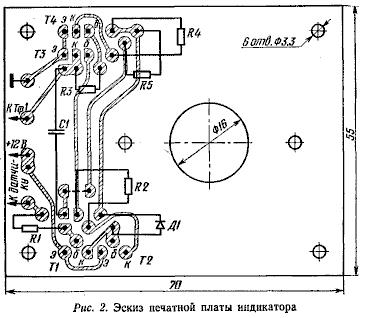 Индикатор собирают на печатной плате из фольгированного стеклотекстолита или гетинакса толщиной 1,5 мм. Чертеж печатной платы показан на рис. 2, а весь указатель в сборе — на рис. 3.