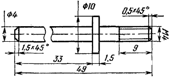 Рис. 4. Конструкция датчика индикатора (латунь Л62) Датчик монтируют в пластмассовую крышку бачка для тормозной жидкости. Один из возможных вариантов конструкции датчика показан на рис. 4. Датчик изготовлен из латуни Л62. Длина датчика зависит от расстояния от крышки бачка до отметки минимального уровня тормозной жидкости в бачке. Для автомобиля ВАЗ-2101 она равна 33—35 мм. В случае, если при установке датчика будет закрыто вентиляционное отверстие в крышке бачка, рядом с датчиком необходимо просверлить отверстие диаметром 1,5 мм для сообщения внутренней полости бачка с атмосферой. Если бачок для тормозной жидкости или трубопровод, идущий от бачка, металлические, то больше никаких доработок бачка делать не надо. Если же бачок и трубопровод сделан из неметаллических материалов (например, у автомобилей ВАЗ), то тормозную жидкость, находящуюся в бачке, необходимо электрически соединить с массой автомобиля. Для этого в бачке в любой точке ниже минимального уровня тормозной жидкости необходимо просверлить отверстие диаметром 4,1 мм, вставить в отверстие винт М4 с цилиндрической головкой, проложив с обеих сторон стенки бачка уплотняющие резиновые и металлические шайбы, и соединить винт с массой гибким многожильным проводом (МТБ, БПВЛ и др.) сечением 0,35—0,5 мм2. Эта необходимость вызвана следующим. Хотя на отечественных автомобилях всех типов тормозная жидкость электрически соединена с корпусом автомобиля (металлический главный тормозной цилиндр, металлические трубопроводы и пр.), точка ее соединения в некоторых случаях находится далеко от датчика, поэтому электрическое сопротивление столба жидкости на участке датчик — корпус составляет единицы мегом. Так, в автомобилях ВАЗ полиэтиленовый бачок соединяется с главным тормозным цилиндром диэлектрическим трубопроводом, и сопротивление участка датчик — корпус в автомобилях этого типа оказывается настолько велико, что транзистор 77 не открывается. Для автомобилей “Москвич-408”, “Москвич-412” заземлять жидкость нет необходимости — бачок расположен непосредственно на главном тормозном цилиндре, и жидкость контактирует с корпусом близко от датчика, поэтому сопротивление этого участка невелико. Замыкания по стенкам бачка между датчиком и корпусом не происходит ввиду большого сопротивления этого участка даже при максимально возможном наличии остатков жидкости на стенках. Кроме того, бачки, изготовленные из пластических масс, плохо смачиваются жидкостью, а стенки бачка расположены вертикально. Поэтому, как показал опыт, можно расположить в крышке бачка два датчика, и один из них соединять с корпусом. Однако расстояние между датчиками для большей надежности работы устройства не следует делать менее 15 мм. В этом случае налаживание устройства сводится к выбору оптимальной чувствительности подбором резистора R1. В некоторых случаях при значительном остатке жидкости на крышке может незначительно измениться частота генерации мультивибратора. При установке в крышку бачка двух датчиков можно использовать один и тот же индикатор для контроля уровня тормозной жидкости в бачке и охлаждающей жидкости в радиаторе. Для этого в радиатор (или в расширительный бачок) устанавливают аналогичный датчик, изолированный от корпуса, и все датчики соединяют последовательно: один датчик в крышке бачк