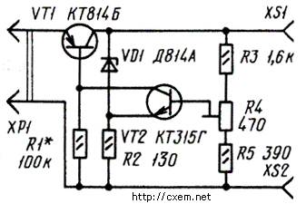 ![]() Собираясь в путешествие на автомобиле, многие из Вас не прочь захватить с собой радиоприёмник или магнитофон, работающие от 9 Вольт. Питать их удобно, конечно от бортовой сети автомобиля. Но её напряжение, во первых, 12,6V и к тому же колеблется в значительных пределах. Здесь и пригодится предлагаемый стабилизатор напряжения для аккумуляторов. Выходное напряжение стабилизатора 9В, макс ток нагрузки 300 mA. При изменении тока нагрузки от 20 до 300 mA выходное напряжение изменяется лишь на 0,17v. Стабилизатор защищен от перегрузки и короткого замыкания на выходе-когда ток превысит максимальный(300mA), стабилизатор отключится. Стабилизатор состоит из регулирующего транзистора VT1 и каскада сравнения, собранного на транзисторе VT2, стабилитроне VD1 и резисторах R2-R5. Подстроечником R4 устанавливается выходное напряжение. Резистор R1 обеспечивает запуск стабилизатора (появление выходного напряжения) при подключении его к источнику питания или после устранения перегрузки на выходе. Максимальный ток нагрузки, соответствующий порогу срабатывания защиты, зависит от резистора R2. Он возрастает при уменьшении сопротивления и наооборот. Минимальное сопротивление ограничивается максимально допустимым током стабилизации стабилитрона. Вместо КТ814Б может быть любой другой транзистор из серий КТ814, КТ816, а вместо КТ315Г - любой из серий КТ315. Регулирующий транзистор устанавливают на радиатор размерами 15 х 20 мм из дюралюминия и вместе с ним прикрепляют к плате. В качестве разъема XP1 - переходник для гнезда прикуривателя (продаютя в автомагазинах). Налаживание стабилизатора сводится к установке подстроечным резистором выходного напряжения 9,1...9,3V без нагрузки и подборе резистора R1 - он должен быть такого сопротивления, что-бы обеспечивался надёжный запуск стабилизатора без нагрузки как при подключении его к бортовой сети автомобиля, так и после устранения короткого замыкания на выходе. Выходное напряжение при подключении резистора R1 может возрастать не более чем на 0,1 V. Если понадобиться эксплуатировать это устройство при токе нагрузки до 500 mA (естественно для этого варианта придется подобрать R2), радиатор для VT1 нужно применить большего размера.
