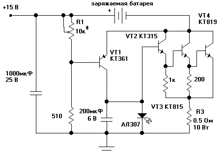 Данная схема позволяет автоматически заряжать автомобильные аккумуляторы. Зарядный ток через батарею в зависимости от напряжения на ней (прикладываемого к Б-Э переходу VT1), регулируется транзистором VT1, коллекторным напряжением которого управляется индикатор заряда на светодиоде (по мере зарядки ток заряда уменьшается и светодиод постепенно гаснет) и мощный составной транзистор, содержащий VT2, VT3, VT4. Резистор R3 ограничивает максимальный зарядный ток, поэтому он должен быть достаточно мощным, не менее 10 Вт, наверное лучше проволочным. Момент полного заряда батареи (и уменьшение зарядного тока до нуля) определяет необходимое напряжение на ней - обычно достаточно 12.5 В (!). Konstantin (RK1NA) утверждает (и ,похоже, меня он тоже убедил), что электро-химические потенциалы используемых материалов свинцовых аккумуляторов позволяют обеспечить ПОЛНУЮ зарядку батареи лишь при напряжении в 13.8 В (!). Т.е. необходимо устанавливать порог заряда чуть больше 13.8 В, например 13.9 В, при котором обеспечивается зарядка "до отказа", на полную емкость батареи. Этот порог устанавливается резистором R1, порог зависит от типа применяемых транзисторов.