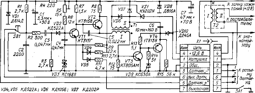 Довольно частые отказы электронного коммутатора 36.3734 в системе зажигания снижают эксплуатационную надежность автомобилей ВАЗ-2108, ВАЗ-2109. Для улучшения процесса поджигания горючей смеси в двигателе этих автомобилей увеличен искровой промежуток в запальных свечах и повышено выходное высоковольтное напряжение, развиваемое системой зажигания. Из-за импульсных выбросов в цепи первичной обмотки катушки зажигания, достигающих 400 В, имеют место случаи повреждения выходного транзисторного ключа коммутатора. Кроме того, оказывается неисправной микросхема. В результате ремонт коммутатора становится недоступным для многих автолюбителей. Описываемое ниже устройство предназначено для замены вышедшего из строя коммутатора 36.3734. Оно может работать совместно с бесконтактным датчиком-распределителем, установленным на двигателе указанных автомобилей. При этом зазор запальных свечей следует уменьшить, что снизит нагрузку на изоляцию свечей, высоковольтных проводников, распределителя. Уменьшение искрового зазора компенсировано увеличением энергии и длительности искрового разряда, причем зазор пробивается дважды в течение одного цикла искрообразования. За основу устройства взят блок, описанный в [1], в котором изменена схема источника запускающих импульсов и введены элементы, обеспечивающие работу блока от бесконтактного датчика 40.3706. Для проверки работоспособности датчика, блока и запальных свеч, а также для облегчения налаживания, введен имитатор датчика. Предусмотрена цепь противоугонной блокировки. Блок зажигания состоит из одновибратора (VT1, VT2), усилителя тока (VT3), выходного ключа (VT4) и разрядного ключа (VS1). Разъем XI соединяет блок с бортовой сетью автомобиля, катушкой зажигания Т2 и датчиком (на схеме не показан). Обозначение контактов и проводников такое же, как и у заменяемой системы зажигания [2]. SA1 — противоугонный выключатель. При повороте ключа в положение “Зажигание включено” через контакт 4 разъема Х1 к блоку поступает питание от бортовой сети. Напряжение на бесконтактный датчик подведено через фильтр-стабилизатор R4C1VD1. В источнике запускающих импульсов, выполненном по схеме одновибратора, транзистор VT1 открыт, а VT2 закрыт. Время-задающий конденсатор С 4 заряжен через резисторы R8, R9 и эмиттерный переход транзистора VT1 до напряжения, ограниченного стабилитроном VD3. Если сопротивление выходной цепи датчика велико, то конденсатор СЗ цепи запуска одновибратора заряжен через резисторы R1—R3 до напряжения на конденсаторе С1. В момент искрообразования выходное сопротивление датчика резко уменьшается, поэтому конденсатор СЗ разряжается по цепи: резистор R2 — нормально замкнутые контакты кнопки SB1 — контакт 6 разъема — датчик — контакт 3 — резистор R3. Отрицательный импульс с резистора R3 поступает на эмиттерный переход транзистора VT1 через диод VD2 и закрывает его, а транзистор VT2 открывается. Конденсатор С4 перезаряжается через диод VD4 и резисторы R10, R5, R6. Таким образом, одновибратор вырабатывает положительный импульс длительностью 2,3...2,5 мс. Работа этого узла подробно описана в [1]. Изменяя сопротивление цепи R5R6, можно в широких пределах регулировать длительность импульса одновибратора и соответственно время накопления энергии в катушке зажигания Т2. Резистор R10 ограничивает ток в разрядной цепи времязадающего конденсат