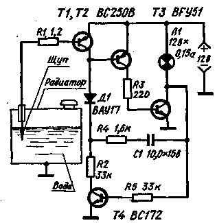 Радиатор автомобиля должен содержать достаточное количество воды. Если водитель своевременно не заметит значительного уменьшения воды в радиаторе, то мотор перегреется. Прибор для контроля уровня воды в радиаторе (см. схему), имеет то преимущество, перед аналогичными устройствами, что при его использовании не возникает электролиза, приводящего к постепенному разрушению стенок радиатора. Применение кремниевых транзисторов делает прибор мало чувствительным к значительным перепадам температуры.