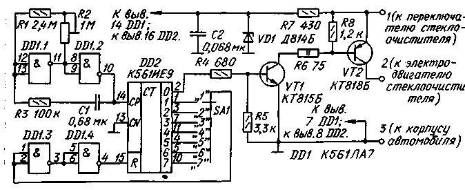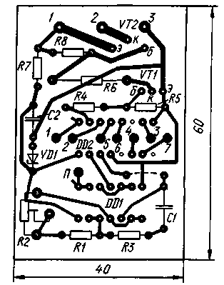 Рис. 1. Схема узла показана на рис. 1. На логических элементах DD1.1, DD1.2 выполнен низкочастотный генератор прямоугольных импульсов, которые поступают на вход счетчика DD2. На транзисторах VT1, VT2 собран усилитель тока. Транзисторы работают в переключательном режиме. При появлении на выходе 0 счетчика высокого уровня открывается транзистор VT1 и вслед за ним VT2 - включается электродвигатель стеклоочистителя. Через некоторое время высокий уровень на выходе 0 счетчика сменяется низким, транзисторы закрываются и электродвигатель отключается, а счетчик продолжает счет. Как только высокий уровень появится на выходе 1 счетчика, этот уровень после двойного инвертирования элементами DD1.3, DD1.4 обнулит счетчик и начнется новый цикл счета импульсов. Если переключатель SA1 перевести в положение с большим номером, момент обнуления счетчика будет наступать позже, т. е. паузы между очередными включениями стеклоочистителя увеличатся. В положении "1" пауза практически отсутствует. Подстроечным резистором R2 устанавливают требуемую частоту генератора,а значит, и время работы электродвигателя стеклоочистителя в каждом цикле. На резисторе R7 и стабилитроне VD1 собран параметрический стабилизатор для питания микросхем. Все элементы узла, кроме транзистора VT2 и переключателя SA1, монтируют на печатной плате из фольгированного стеклотекстолита толщиной 1,5 мм. Чертеж платы представлен на рис. 2.