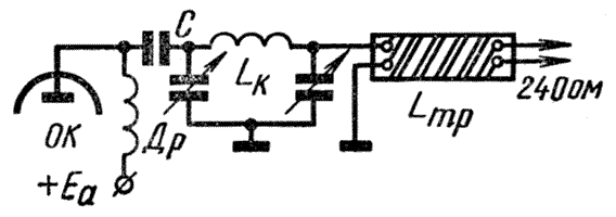 Длина полудиполя составляет 27 м (рис.1а). Излучение антенны направленно в горизонтальной плоскости. Для наиболее полного использования антенны при работе на диапазоне 3,5 МГц необходимо поднять ее над землей на высоту не менее 20 м. Выходное сопротивление антенны в диапазоне 3,5...30 МГц порядка 240...300 Ом. < Рис.1а Согласование фидера с несимметричным выходом передатчика, оконечный каскад которого выполнен по однотактной схеме с перестраиваемым П-фильтром, производится посредством симметрирующего трансформатора. При переходе с одного диапазона на другой никаких переключений и регулировок антенны не требуется. Это особенно важно во время различных КВ соревнований. Трансформатор представляет собой два параллельных провода ПЭЛ 2,0...3,0, намотанных на керамической трубке или стержне диаметром 20...35 мм и длиной 100 мм в количестве 12...15 витков. Расстояние между центрами проводов 5...6 мм. На рис.1б показано включение симметрирующего трансформатора Lтр между контуром передатчика и фидером антенны.